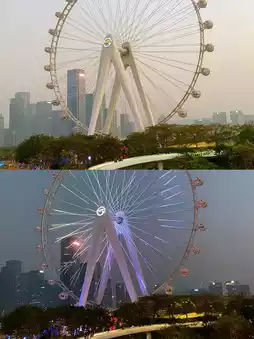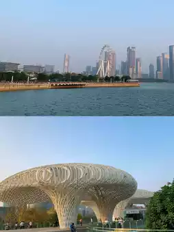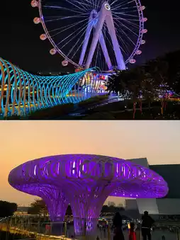 The Bay Area Light Ferris Wheel is the largest Ferris wheel in Asia and the first all-sky view rotating car-mounted Ferris wheel in China. It is 128 meters high and targets the London Eye!