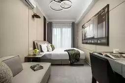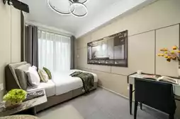 The bedroom is a cozy private space, with a carefully arranged bed and high-quality linens for a comfortable sleep. The room's décor is simple yet tasteful, creating a warm atmosphere.