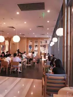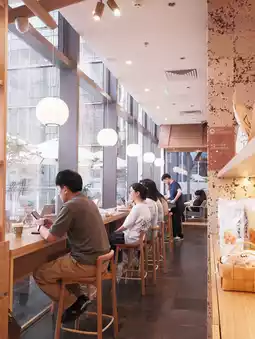 Indoors, there is a bar, wooden tables and chairs for two to four people, which are spacious and comfortable.