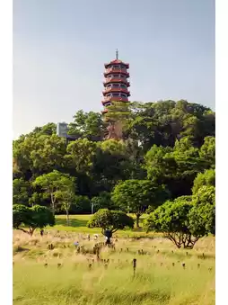 There are trees🌳, grass🌿, flowers💐, chairs🪑, pavilions⛩, and towers🛕. It's a great place to take photos📷.