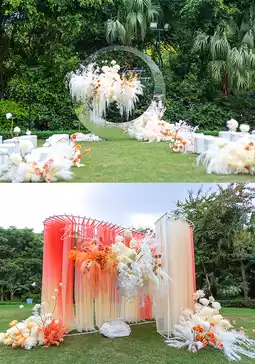 On the other side of the lawn is a carefully decorated dining area🍬🍭🍮. The long tables were arranged in an orderly manner, covered with white tablecloths and decorated with exquisite tableware and flowers🌷. Here, guests can enjoy delicious food and drinks while admiring the beautiful scenery of the lawn wedding.