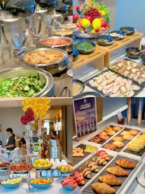 There is a wide variety of breakfast dishes, such as salads, breads, dim sum, cooked food, fruits, drinks, and instant congee noodles. The taste is quite good.