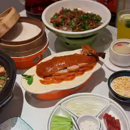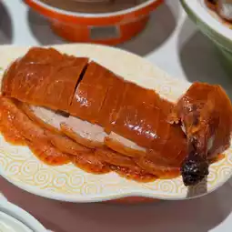 The specialty is Peking duck that is freshly roasted in a hanging oven