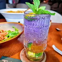 For drinks, we ordered the [Thai Royal Milk Tea], which had an excellent sweet and fragrant taste, with the perfect balance of milk and tea flavors. Another drink was the [Butterfly Pea Flower Lime Yuzu Soda], which was colorful and refreshing, with the sourness of lime and the fragrance of yuzu perfectly matched.