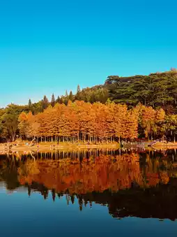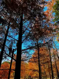 As the breeze blows, the bald cypress trees sway gently and the fallen leaves float down, like a dreamlike scene. The lake reflects their graceful shadows, adding a touch of poetry.