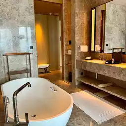 🛏The room I stayed in was even more amazing. I chose a sea view suite. As soon as I entered the room, the spacious and bright space and the elegant and exquisite decoration came into view. The floor-to-ceiling windows bring the beautiful outdoor scenery into the room without reservation. During the day, the sunlight shines through the windows onto the soft carpet, filling the entire room with a warm glow; at night, the dazzling city neon lights and the sparkling sea surface complement each other, creating a beautiful sight. The furniture, bedding, etc. in the room are made of high-quality materials, soft and comfortable to the touch, and every design detail reflects the thoughtful care for the guests. The bathroom is extremely luxurious, with an oversized bathtub, a separate shower, and high-end toiletries. When you are tired from playing, take a bath and all your fatigue will be swept away.