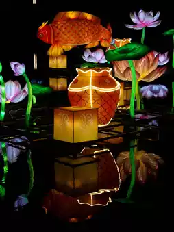 The roadsides are dotted with lanterns, like falling stars. Above the lake, the water curtain and the lights blend together beautifully.