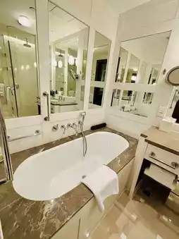 I stayed in a Deluxe Twin Room, which spans 45 square meters, offering a spacious and comfortable environment. The room's design is modern and elegant, creating a relaxing atmosphere as soon as you enter. The bathroom is exquisitely decorated and features a large bathtub.