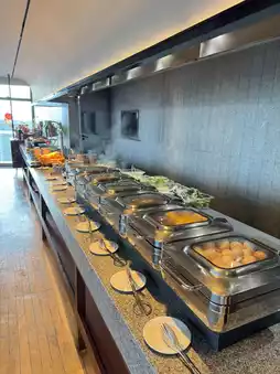 The hotel's decor is very new and clean, and the included breakfast is a great selling point. Breakfast is served on the 25th floor, the highest floor of the hotel, and having breakfast by the window is a delightful experience 😌. The breakfast food is not subpar at all, with three types of porridge to choose from, and it's a buffet!
