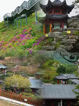 Stroll along the winding plank road, with the Nine-Curve Flower Path full of blooming flowers on one side, and the mountain top viewing platform on the other. It only takes 10 minutes to walk to the top, where you can see the European-style villas. The Chinese-style ancient pavilions along the way add a touch of elegance to the mountains and forests. The S-shaped curve of the park is also very interesting, with a wonderful blend of Chinese and Western styles. On the left is the stylish villa area, and on the right is the gentle Suzhou-style garden, instantly giving you a unique background.