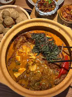 As soon as it arrives at the table, you can smell the aroma of butter mixed with spices. The beef is cut to the perfect size, firm yet tender. After being stewed in the clay pot, it absorbs the rich broth, giving it a delightful spicy kick!