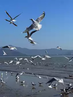 Standing on the shore and watching the seagulls playing, I felt extremely peaceful and happy in my heart.