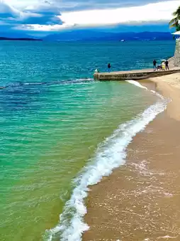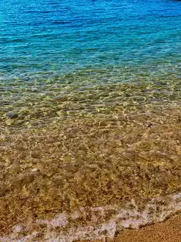 The sand on this beach is as fine as snow, shining charmingly in the sun, as bright as sapphire.