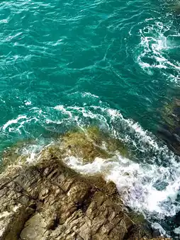 The clear sea water gently laps against the shore, creating layers of white foam. In the distance, the blue sea meets the blue sky, which makes people feel relaxed and happy.