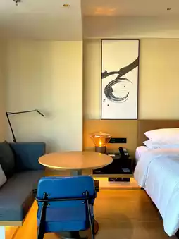 As soon as you open the door to the room, you are greeted with floor-to-ceiling windows offering a beautiful view of the seaside. The sofa is as wide as a bed, making it very spacious and comfortable.