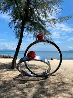 The beach is filled with romantic photo spots, including a pink wedding chapel, white love steps, and a romantic flower boat docked by the shore. Every corner offers a perfect backdrop for stunning photos. Whether it's a couple's date or a friend's outing, you can capture beautiful moments here.