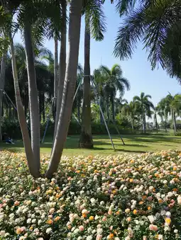 Continue walking along the seaside to Qianhai Stone Park. The large green lawn, blue sea, palm trees, and romantic Ferris wheel blend together. Now is the season when roses are in full bloom, and there is a sea of colorful flowers, which is super beautiful.