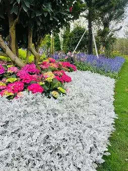 Not far away, large swaths of bright tulips stand tall and graceful. Red ones blaze like fire, burning with the vitality of spring; yellow ones rival gold, shining with the sun's brilliance; purple ones are dreamy, imbued with an air of mystery. They stand close together, yet each vies for attention, like carefully rehearsed dancers, moving to the melody of spring on the verdant lawn. Their varying heights create a colorful visual symphony.