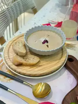 The mushroom soup has a smooth texture and strong mushroom flavor