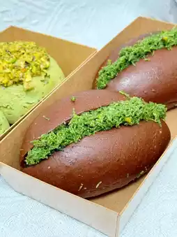 This one is in love at first try 😋 Chocolate bread sandwiched with pistachio crisps, a bite down very crispy mouth, moderate sweetness, pistachio fans do not miss.