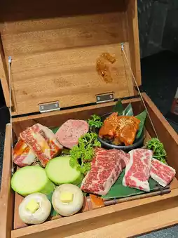 a variety of high-quality meats; including thick-cut beef tenderloin (original), thick-cut beef tongue (flavor), beef ribs (fruit sauce), snowflake beef ribs (garlic), thick-cut diaphragm;