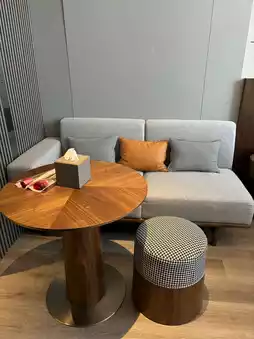 The overall experience of this hotel is quite good. The rooms are modern and comfortable, with soft bedding and city line murals on the walls adding to the artistic atmosphere. The sofa and coffee table in the living room area are reasonably furnished for resting and placing items.