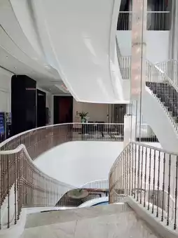 The hotel boasts a unique design that seamlessly blends British elegance with Oriental charm. The lobby is filled with the fragrance of ginger flowers and adorned with oil paintings, sculptures, and floral arrangements. A four-story marble spiral staircase, complemented by crystal chandeliers and blue fish-scale carpets, exudes luxury and sophistication.