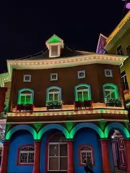 The street lights came on, casting soft light on the quaint streets. The shop signs are colorful, setting off the bustling crowd.