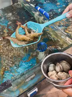 There are freshly cooked fresh seafood, freshly cut beef, beef ribs,
