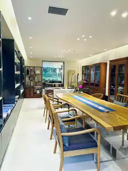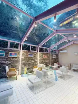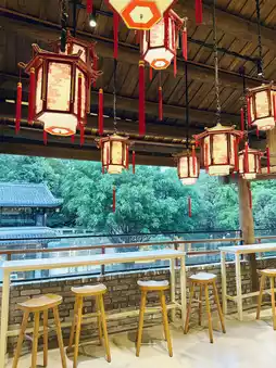 The architecture is very antique, with classical garden buildings and ancient tables and chairs.