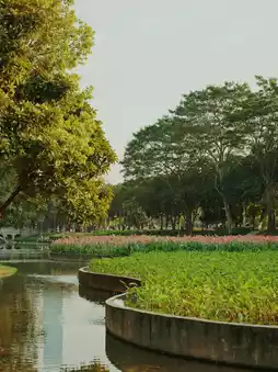 Within the park, tall trees with dense foliage form a natural green barrier, isolating it from the hustle and bustle of the outside world. Clear streams meander through the park, sparkling under the sunlight.