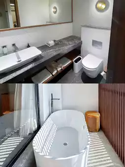 The homestay has a total of 14 rooms and 5 room types. All rooms are equipped with floor-to-ceiling windows, and each room has an excellent sea view. 🌊Lying on the soft bed, you can see the vast sea as soon as you open your eyes. The sea breeze is gentle and very pleasant! The interior of the room is mainly decorated in the wabi-sabi style, with rattan chairs, mid-century log furniture, and tropical elements, which is quiet and high-class. The mini bar, five-star hotel Serta mattress, and Ferragamo toiletries 🧴show the quality in the details.