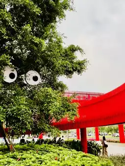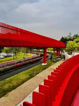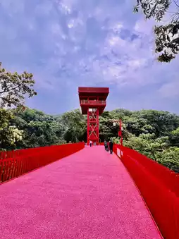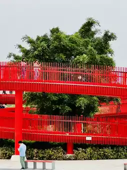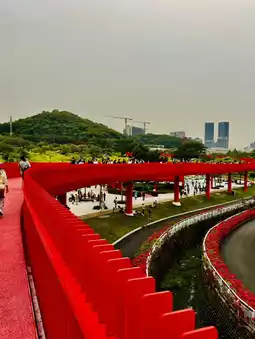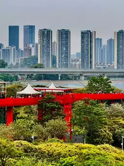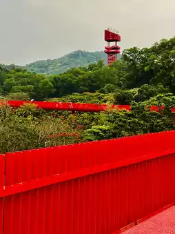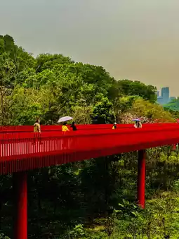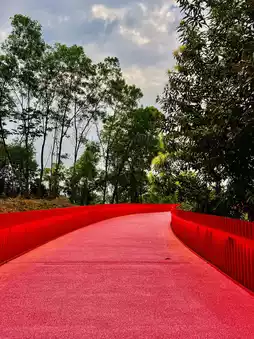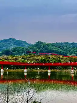 The park is built on the mountain, with a 4-kilometer-long walking trail starting from Xincheng Park in the west and ending at Dadingling Park in the east. The mountains are undulating, and the Rainbow Bridge is like a flowing red ribbon, weaving through the green mountains. The highest observation deck is the best viewing point, overlooking the winding Hongqiao Bridge. The collision of the red bridge and the green trees creates a strong visual impact. It is the pedestrians strolling and embellishing the Rainbow Bridge that add dynamism to this red ribbon.