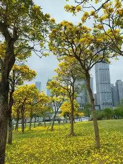 As soon as you enter the park, you will see golden colors everywhere. The yellow bell flowers bloomed wantonly, like golden butterflies perched on branches. Against the backdrop of blue sky and white clouds, they were so beautiful that they seemed out of this world. As the breeze blows, the flowers sway gently and fall down, forming a golden flower carpet, which is extremely romantic.