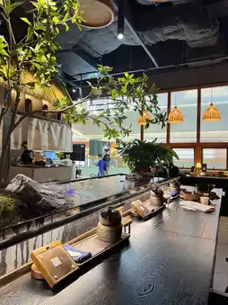 The restaurant itself is incredibly captivating: the central hall features an artificial mountain covered with flowing water and mist, creating a dreamy atmosphere 😍. Even before looking at the menu, the ambiance is already enticing.
