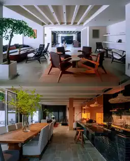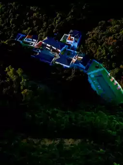 Six white buildings feature traditional white walls and dark tiles, arranged like a village. Geometric lines cast shadows in perfect harmony, while the play of light and shadow in the southern mountain forest shifts with time. Every detail of light in the courtyard seems sculpted, with a single tree casting ever-changing shadows throughout the day. The peaceful, gentle architecture creates a deeply relaxing atmosphere.