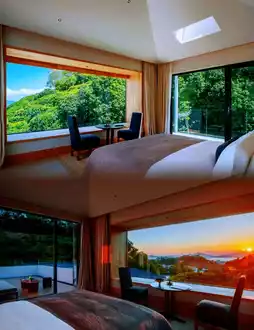 The 24 guest rooms are embraced by mountain views, with lush greenery visible at a glance. Room furnishings are minimalist yet meticulously designed, with stone and wood elements creating a natural sanctuary. Enjoy the sunset through floor-to-ceiling windows, with distant mountains offering a healing, calming experience!