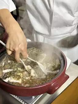 [Headwater Seaweed Surf Sea Cucumber] Use hot old chicken soup with dried shrimp and pepper, now infused with sea cucumber and headwater seaweed. The soup is clear, fresh and refreshing, warming and refreshing. There’s also a little bit of very beneficial chrysanthemum blue in it to bring out a little bit of sweetness and bitterness.