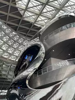 In the middle of the plaza, between the two exhibitions, is "The Cloud", a public area consisting of a cafe, a bookstore, and a souvenir shop. All functions on every floor of The Cloud are surrounded by curved, shiny silver surfaces, reflecting the images of the 2 exhibitions that tell different stories but can be combined under the same building, as the designer intended.