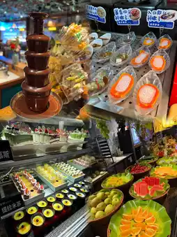 The dessert counter features ice cream, cakes, and a chocolate fountain that kids can't resist, along with a variety of fresh fruits—truly irresistible.