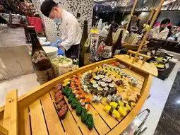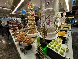 This hotel package includes breakfast and dinner buffet, the day in the lounge all-you-can-eat after 🍸 around six o'clock to go to the restaurant to eat buffet dinner, the restaurant is very large, there are many things to choose from, just in time for Christmas, there are many Christmas decorations and desserts, very Christmas atmosphere 🎄 Also Live Band🎶 The special thing about the buffet here is red, white and beer, and plenty of soda and juice for you to choose from🍾 Food, we think the more special is the grilled oysters🦪, steak🥩 and knife cut beef, very tender😋 Lots of fruits and desserts.