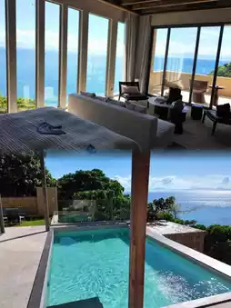 Soaking in the private hot pool while sunset painted the ocean orange like soda