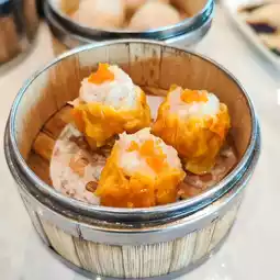 ~The crab roe siu mai is topped with orange-red seeds, and when you bite it, the gravy splashes out, with a faint truffle aroma.