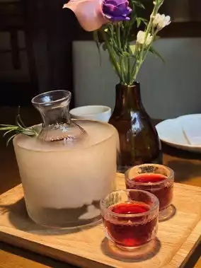 End your meal with a chilled pitcher of hawthorn and plum juice. It’s sweet and tangy, refreshing and perfect for cleansing the palate. Served in a glass pitcher with an ice bucket and floral decorations, it’s a feast for both the eyes and taste buds.