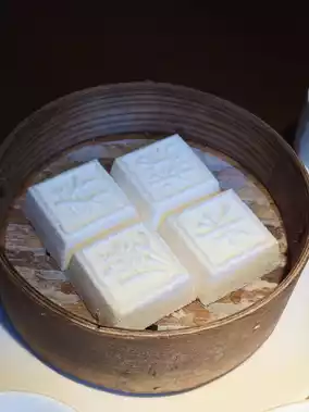 This square-shaped white rice cake has a minimalist appearance, with ancient-style characters printed on its surface. Its texture is as soft as snow, melting in your mouth with a subtle rice and bean aroma. Free from excessive sweetness, it’s a pure and delightful appetizer.