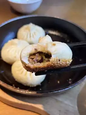 These dumplings have thin skins and generous fillings, with the bottoms pan-fried to a golden crisp and sprinkled with sesame seeds. The filling consists of stir-fried shiitake mushrooms, vegetarian meat, and cilantro, bursting with aroma. Each bite releases juicy flavors, rivaling traditional meat dumplings. This was the most surprising dish of the meal.