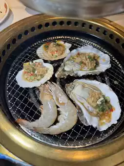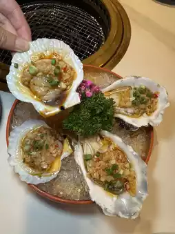 Grilled oysters, grilled scallops, grilled eel, grilled durian, grilled black tiger prawns, cheese baked prawns, sea snails, mussels, squid, cuttlefish intestines