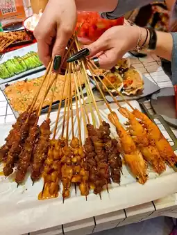 Fresh seafood, beef and lamb skewers, sweet and tender oysters