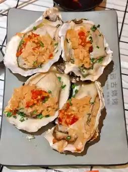 A plate of 4 large [grilled fresh large oysters] The oysters are fresh and bursting. After simply grilling, the seafood is more intense, plus garlic chili, fresh and appetizing, really can not be missed