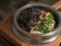 Matsutake beef claypot rice ~ When the staff opened the wooden lid of the pot, the steaming hot rice, beef, and matsutake mushrooms were quickly mixed together. The aroma of matsutake and beef immediately filled the air 😋.